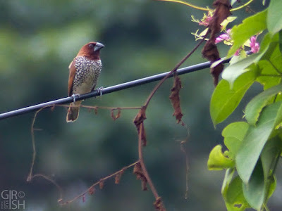 There was one activity that I noticed and couldn't stop myself, Scaly-breasted Munia was busy picking up and carrying a grass blade inside a small hiding created by climbers near an electric pole. Suddenly I realized, it's a breeding time for these Munias. And for this pair, the male bird was successful at his skills to make female bird attracted and chose for breeding this season.